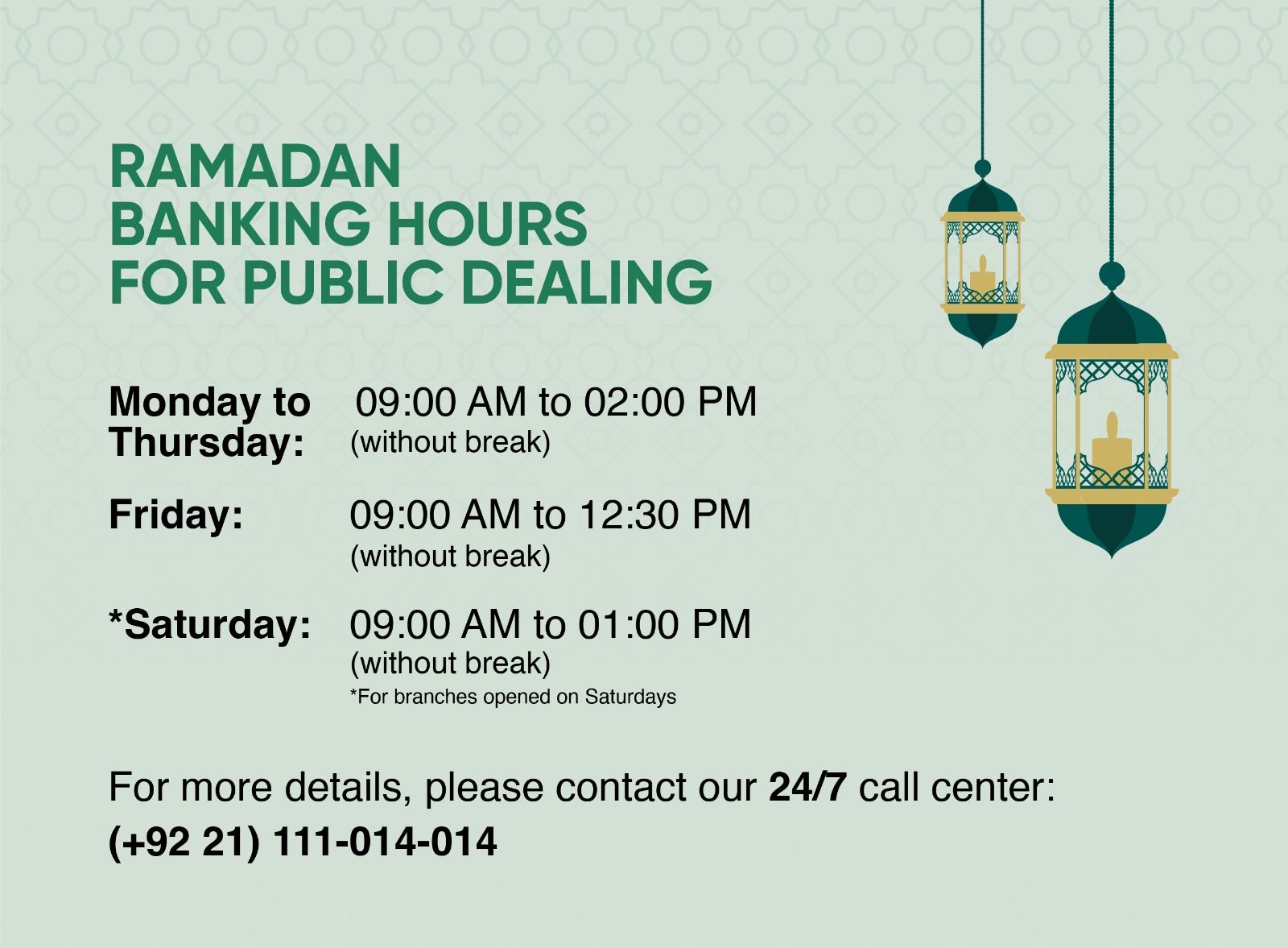 View DetailsFor the month of Ramadan, the following timings will be observed in the Branches.